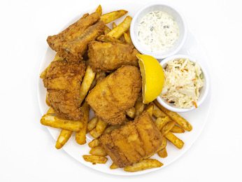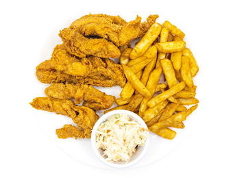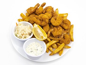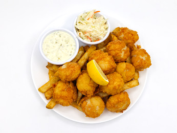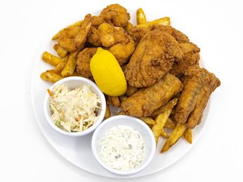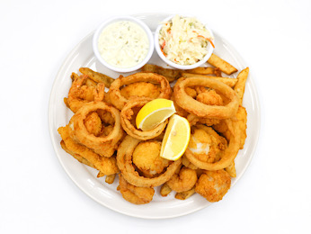 Shrimp, Scallops, Fish, Onion Rings, French Fries, Tartar Sauce and Coleslaw.
