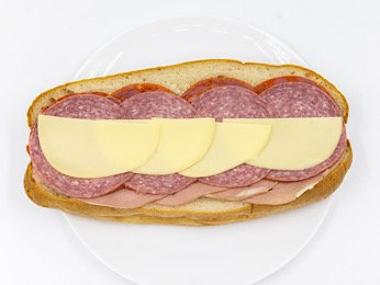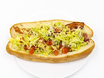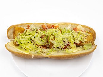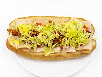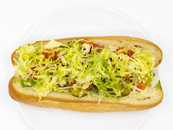 Sub Roll, American, Lettuce, Tomato, Pickles, Onions, Green Peppers and Hot Peppers.