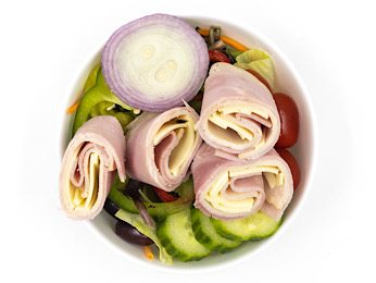 Lettuce, Spring Mix, Carrots, Tomatoes, Cucumbers, Red & Green Peppers, Red Onion, Kalamata Olives, Pepperoncini Peppers, Mortadela, Genoa Salami, Hot Capicola, Ham and Provolone.