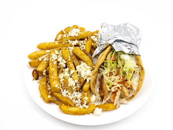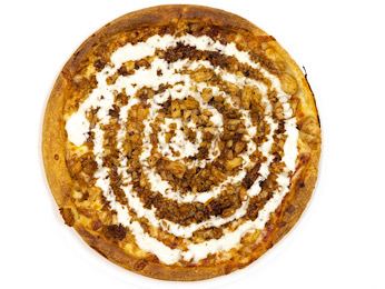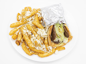 Pizza Cheese, Gyro Meat, Onion, Tomato, Feta Cheese and Side of Tzatziki.