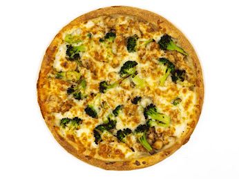 Pizza Cheese, Broccoli, Grilled Chicken and Afredo Sauce.