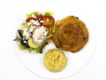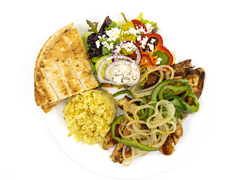 Pita Bread, Greek, Iceberg Lettuce, Spring Mix, Carrots, Kalamata Olives, Red Onions, Red & Green Peppers, Tomatoes, Pepperoncini, Cucumber and Feta Cheese.