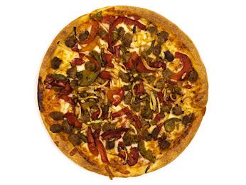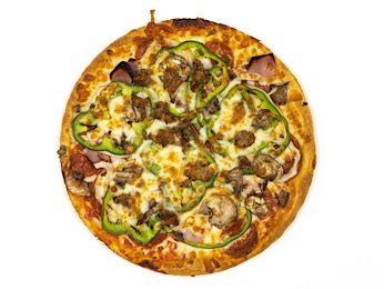 Pizza Cheese, Pizza Sauce, Pepperoni, Sausage, Ham, Meatball, Onion, Green Pepper and Mushroom.