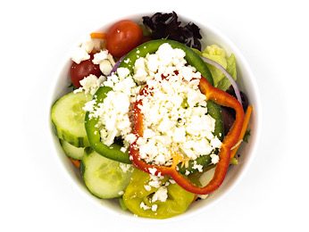 Feta Cheese, Lettuce, Tomato, Cucumber, Onions, Olives, Banana Peppers and Greek Dressing.